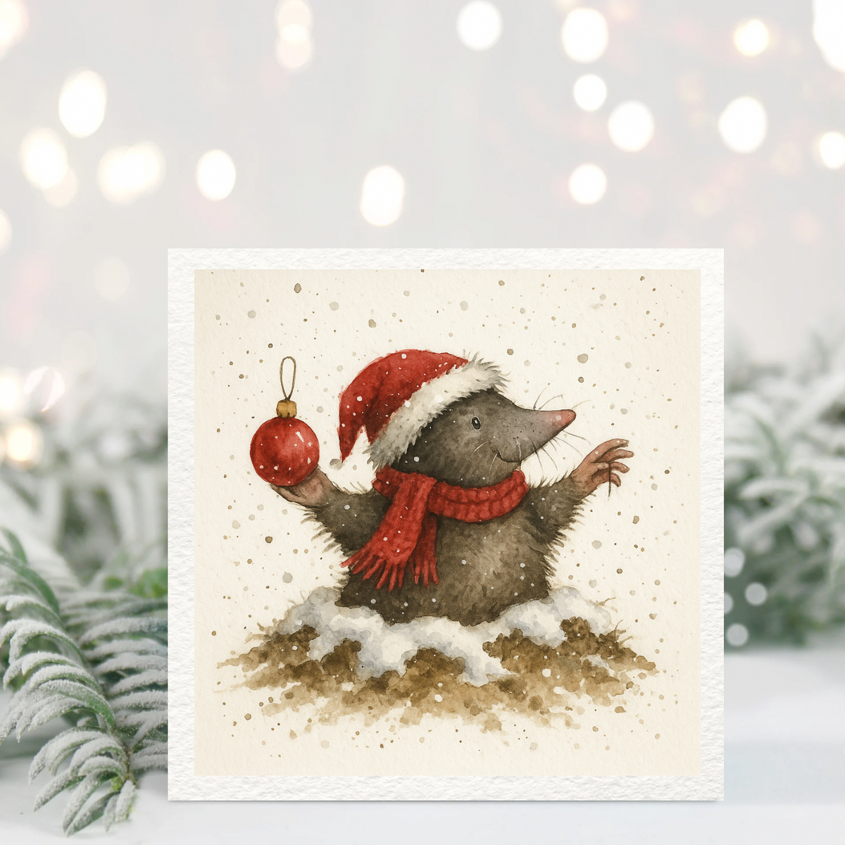 Cute Mole Christmas Card – Santa Hat & Bauble, Winter Animal Illustration